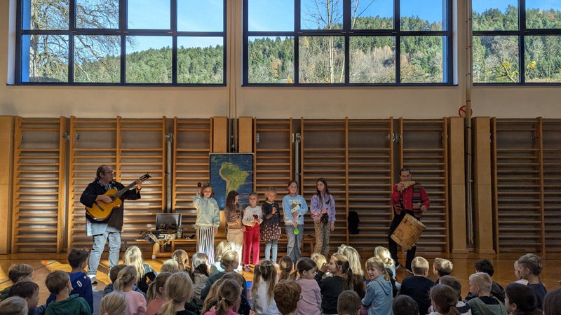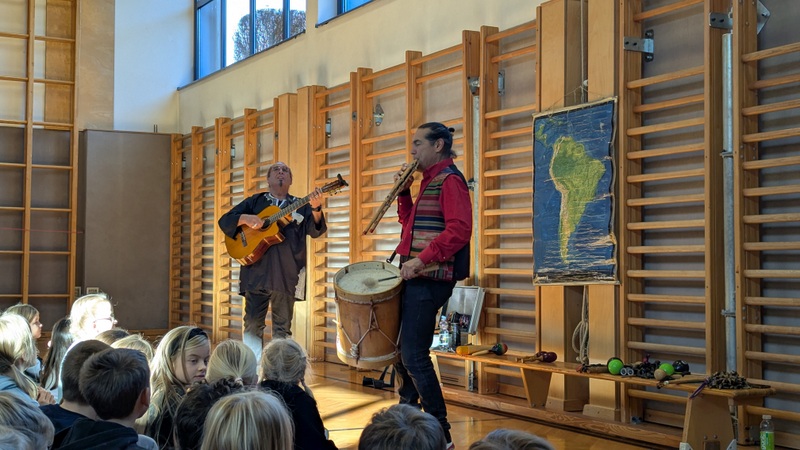 Am Dienstag, dem 11.11., war ein Musikerduo aus Chile zu Besuch. Wissenswertes über die Geographie und Tierwelt Südamerikas wurde mit Musikstücken vermittelt. Es wurde im Rhythmus geklatscht, gesungen und mitgespielt. Es machte allen großen Spaß auch einige spanische Wörter aus dieser Veranstaltung mitzunehmen!