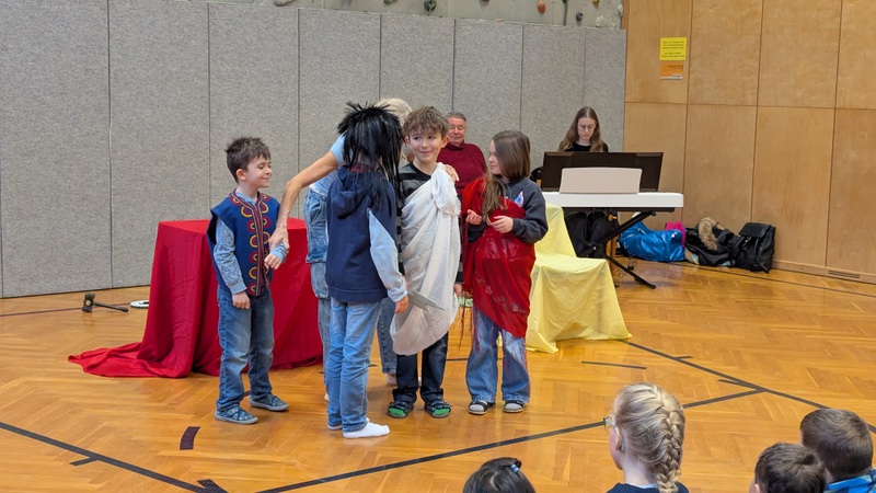 Auch in diesem Schuljahr war das Mozart-Ensemble Luzern bei uns zu Gast. Sabine begeisterte die Kinder mit griechischen Sagen und der Musik von Jacques Offenbach. Einige Schüler:innen durften in Kostüme schlüpfen und ihr schauspielerisches Können als Götter, Göttinnen oder Sagengestalten auf der Bühne zeigen.